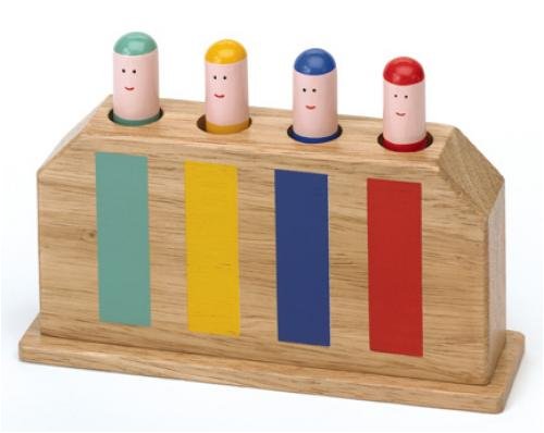 - 4 color peg figures which bob up and down on concealed springs. Pegs are removable